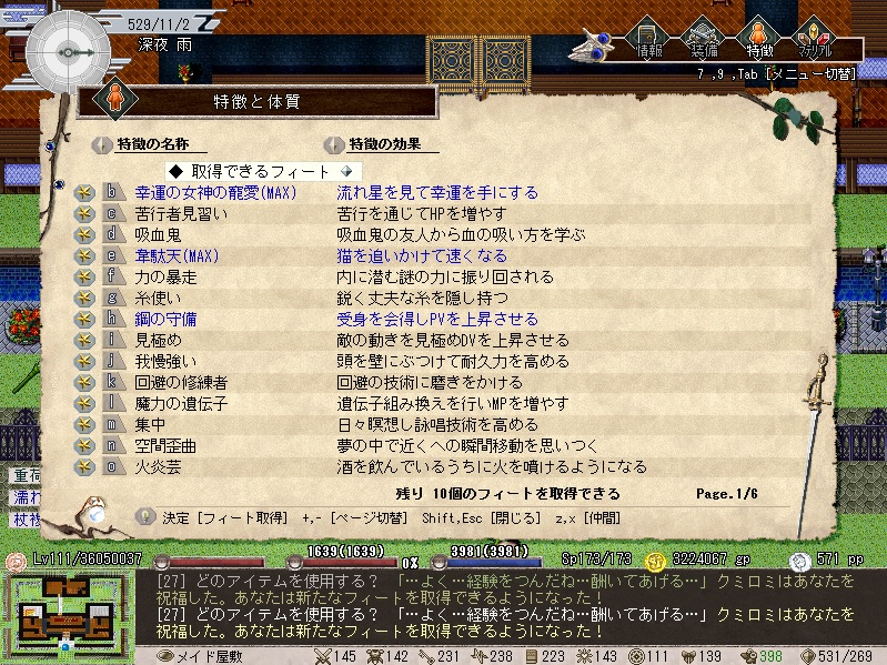 クミロミの秘密の経験は、新たなフィートを、(レベル/10+1)個まで獲得できるアイテムなのだぽん。